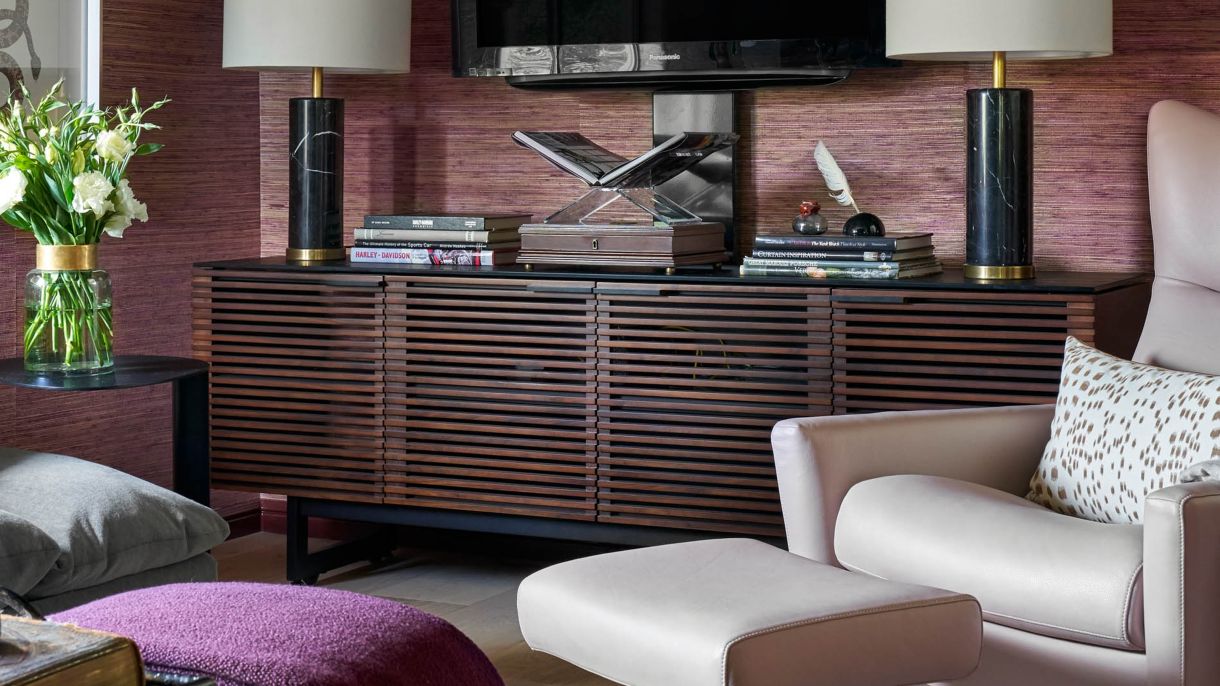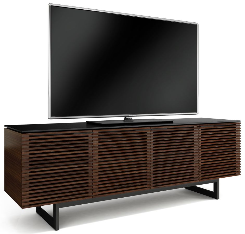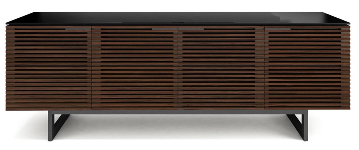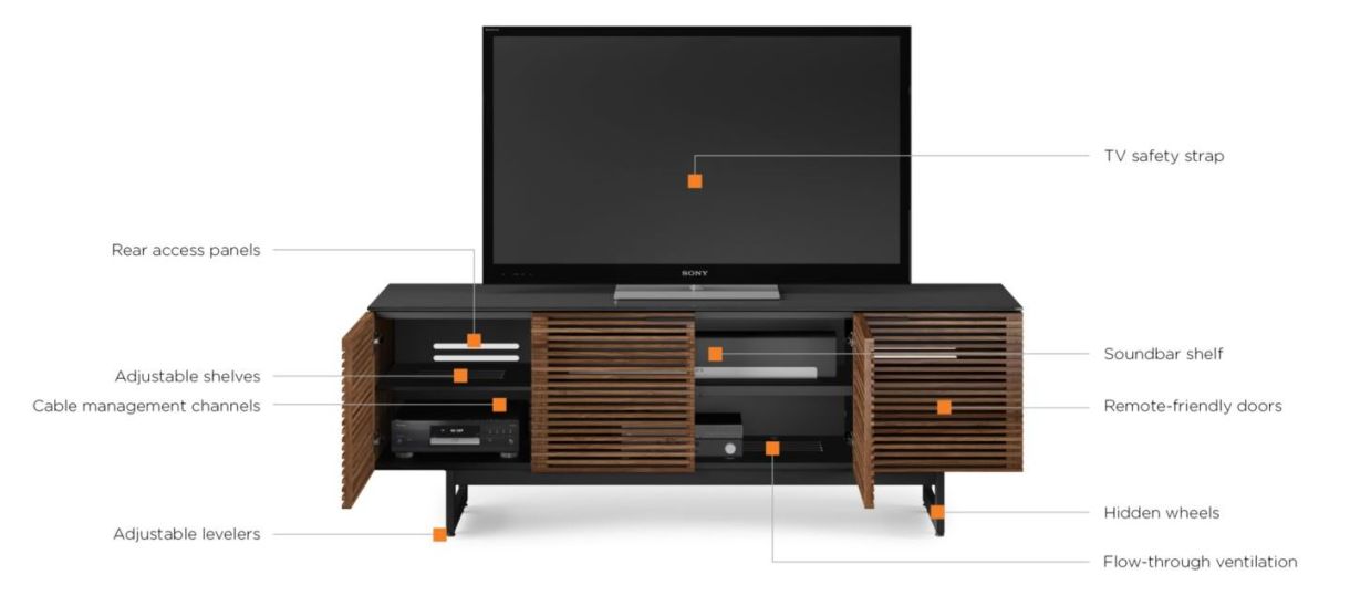 It has a stylishly slim and sleek profile and features louvered doors that ensure components stay out-of-sight while air, sound, and media signals pass freely through.