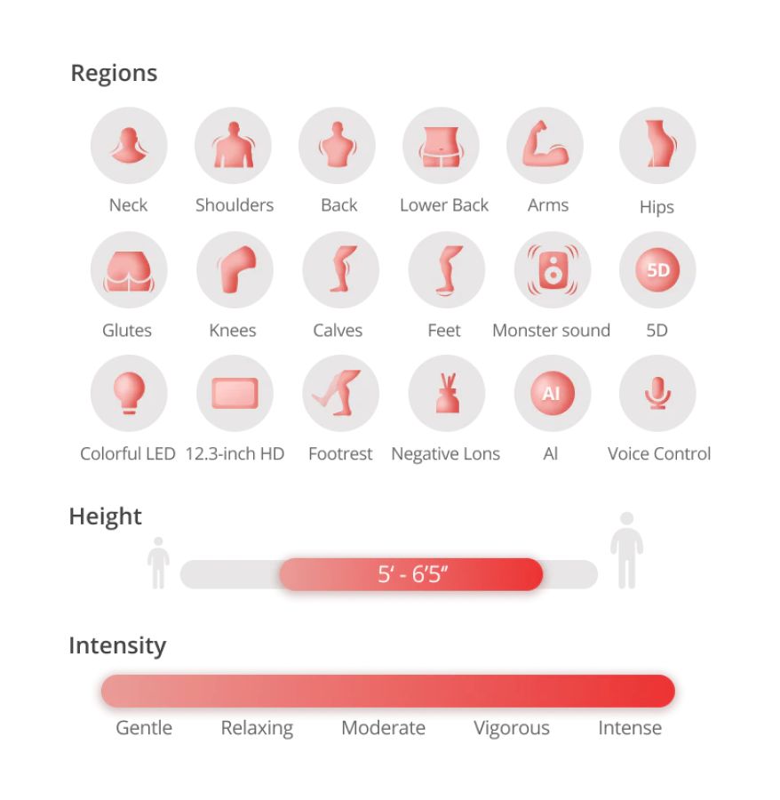 everything in a 4D massage chair, plus the addition of 27 precision pressure sensors. These smart sensor monitors in real-time how much force is being applied making sure the correct amount of pressure is applied to any part of your spine.