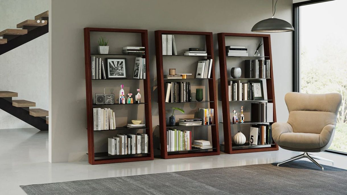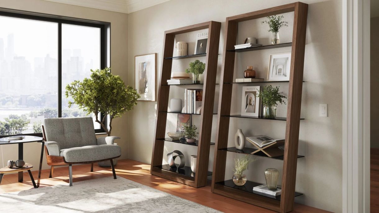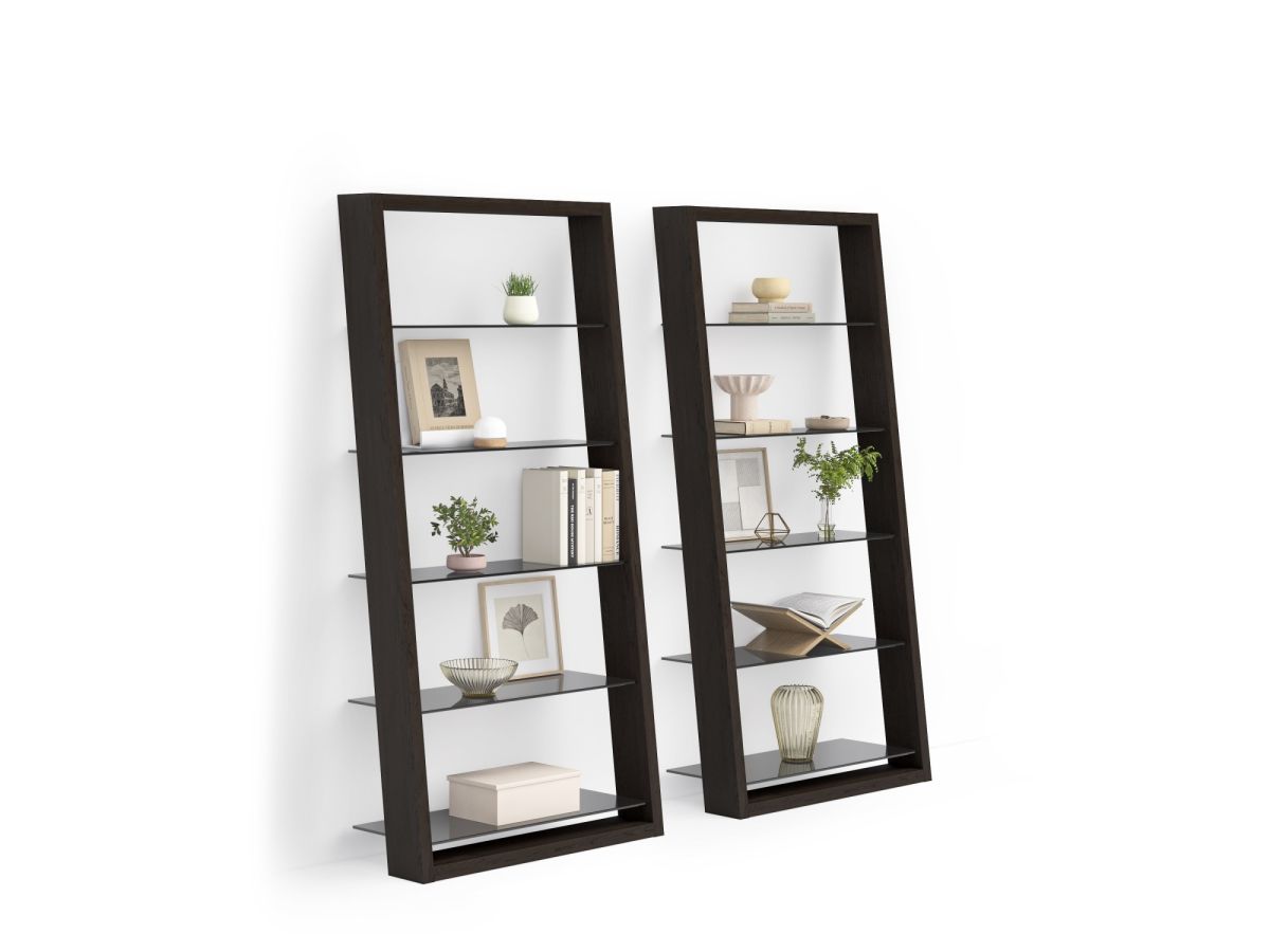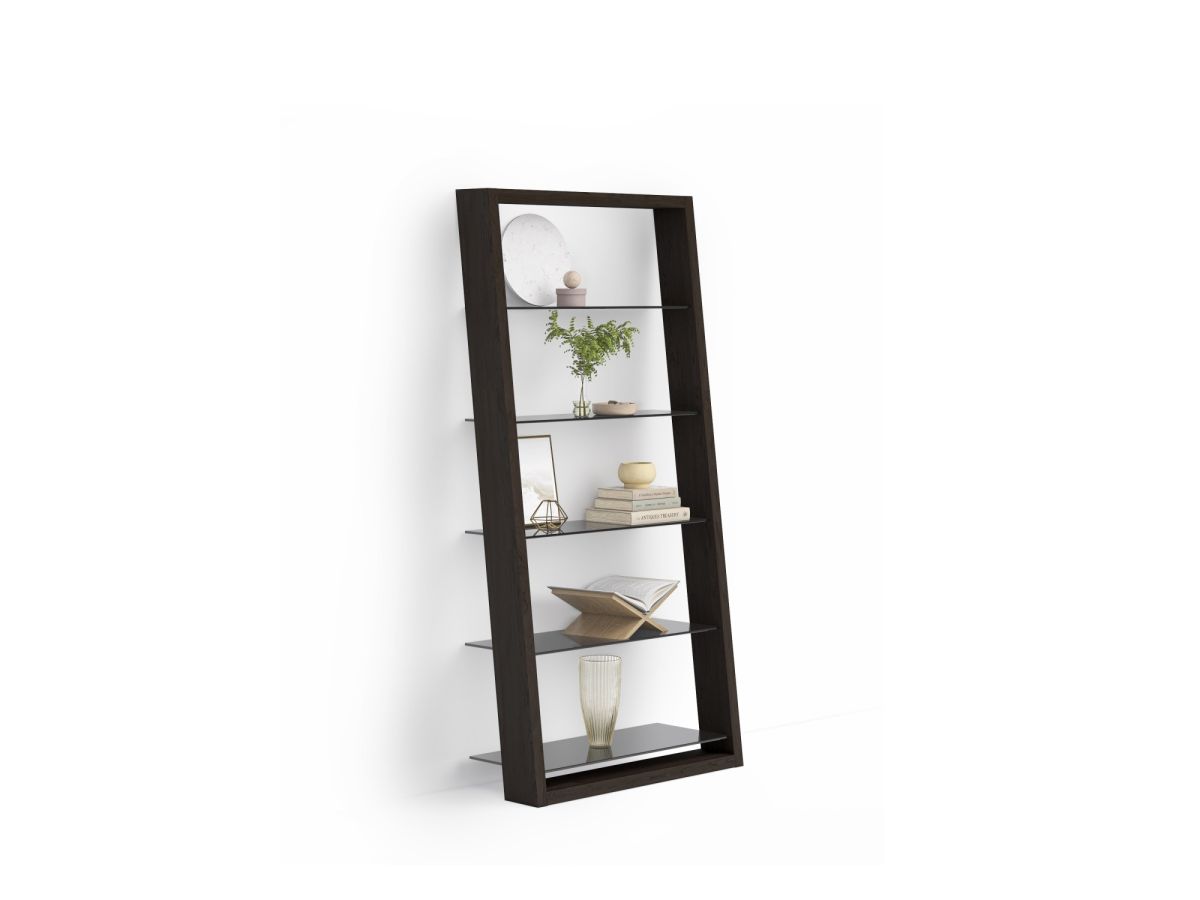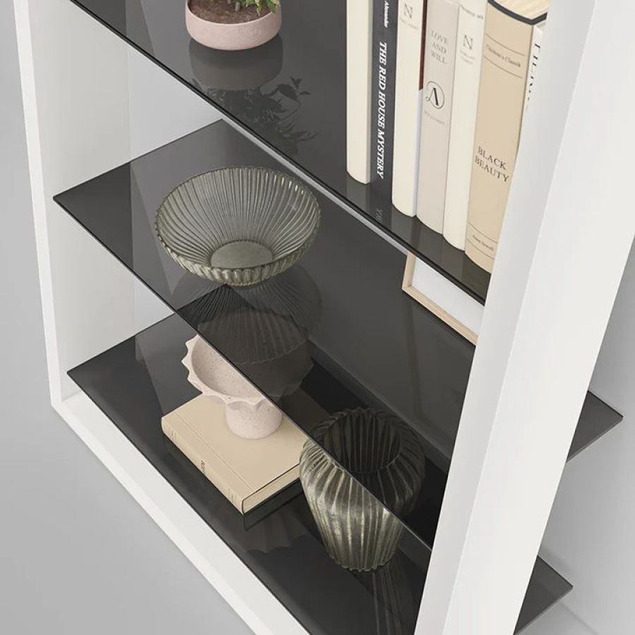 Available in four wood finishes with grey-tinted tempered glass shelves. Eileen can be a beautifully understated complement to any home or office.
