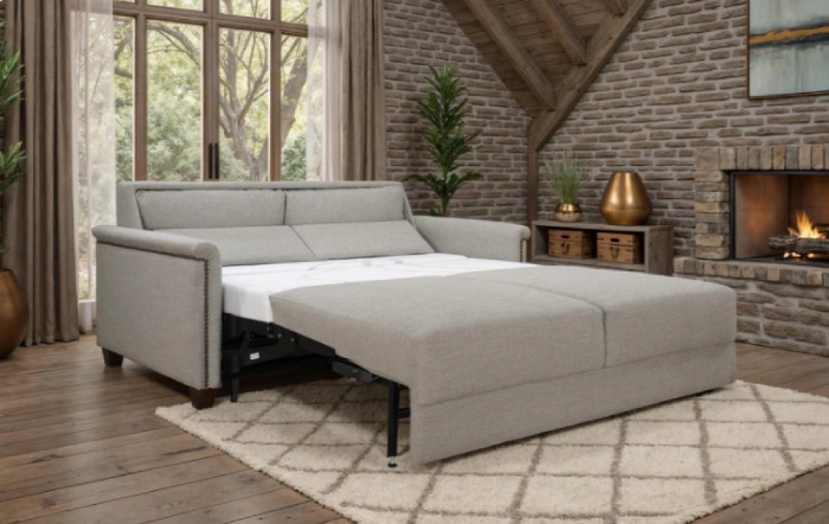 Our newest sleeper sofa, called the SLOFA is on display! Easy to use and proudly made in the USA. Extremely easy to open and close. You will be wowed by the smooth mechanism and comfort. Perfect for small spaces the Slofa can be used in guest rooms, multi-use family rooms, studio apartments, cabins and more. It sleeps like a real bed, but looks like a modern sofa. Cushions aren’t bulky and they stay on the sofa while it transforms into bed.