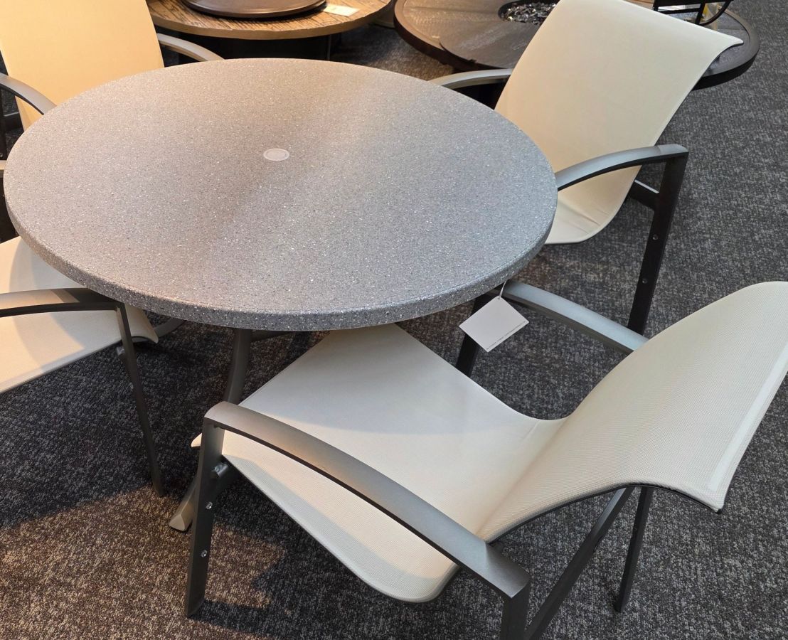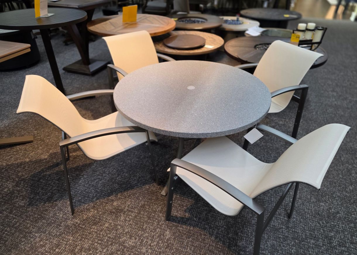 Relax while you dine with Metropolis outdoor dining from Woodard and Tropitone. This beautiful & moden, aluminum collection comes in many forms from sling dining, padded dining, chais lounges, cushion chairs, sectionals and more.