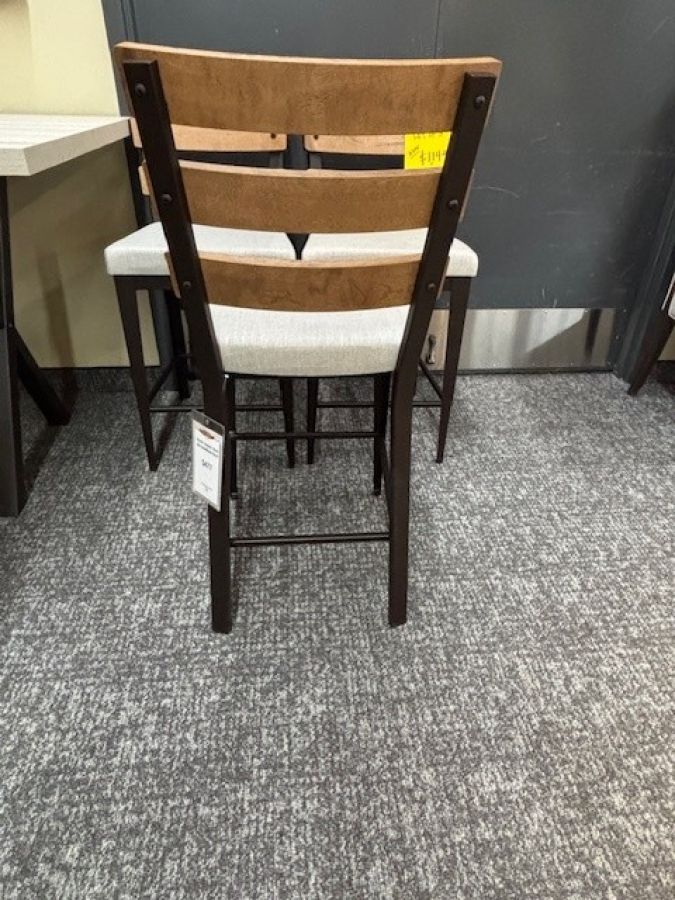 Set of 3 counter height Dexter Stationary stools by Amisco. Made in Canada, solid birch backrest, dark brown powder coated metal finish with fabric seat.